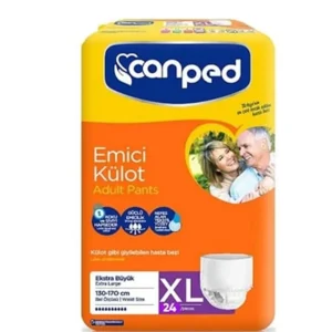 Canped Emici Külot Hasta Bezi, külot şeklinde giyilebilen, yüksek emiciliğe sahip bir hijyen ürünüdür. Normal iç çamaşırı gibi giyilip çıkarılabilmesi, kullanıcının bağımsızlığını desteklerken, pratikliğiyle bakım verenlerin işini de kolaylaştırır. “XL” bedeni, daha geniş beden aralıklarındaki kullanıcılar için özel olarak tasarlanmıştır. 24 adetlik paketiyle, kullanıcıların uzun süreli ihtiyaçlarını karşılar.