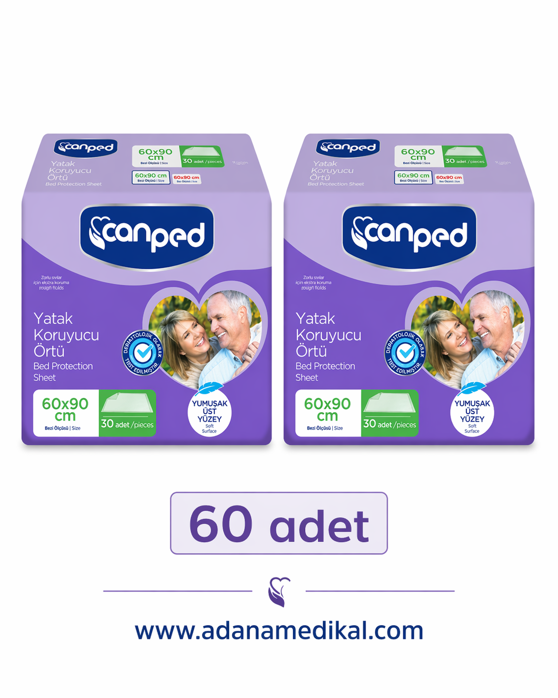 Canped Yatak Koruyucu Örtü 60×90 cm 30 Adet, yatak yüzeyini sıvı sızıntılarına, kirlenmeye ve neme karşı korumak için tasarlanmış kullanışlı bir bakım ürünüdür. Hasta bakımı, yaşlı bakımı, çocuk bakımı ve günlük hijyen ihtiyaçlarında güvenle tercih edilebilir.