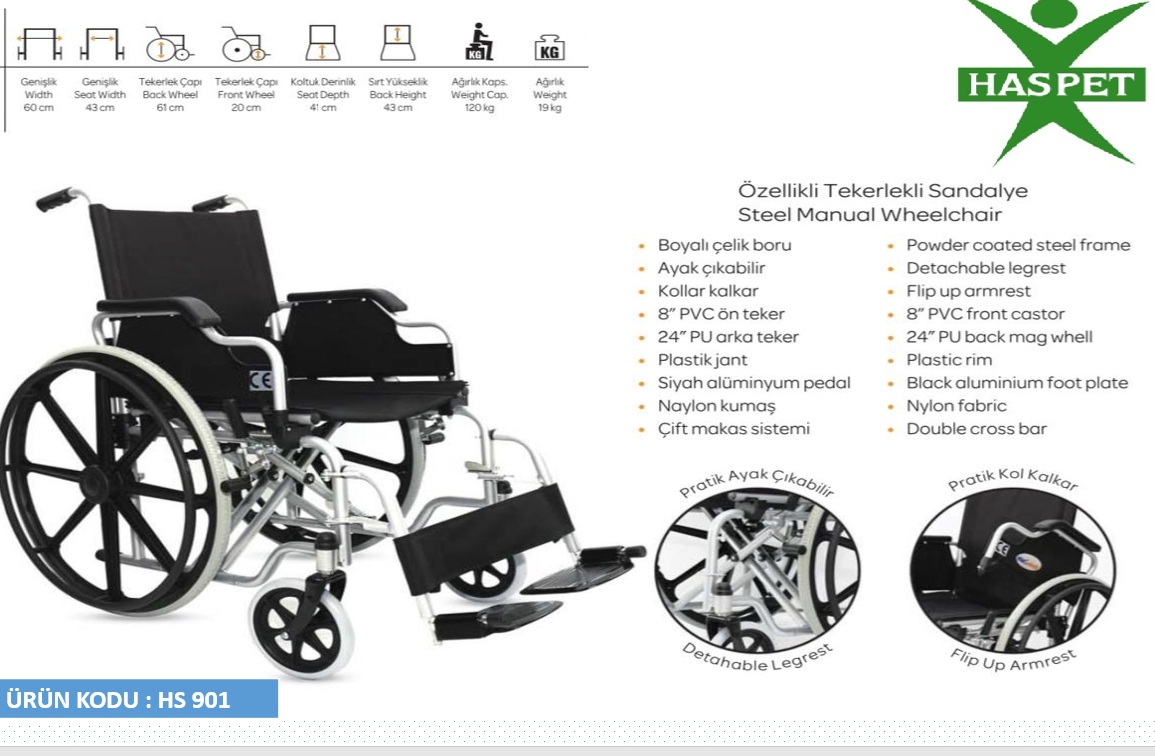 Katalog verilerine göre HS 901 modelinin üstün özelliklerini taşıyan bu sandalye, sağlamlığı ve fonksiyonelliği şık bir tasarımla birleştirir. Özellikle hasta transferini kolaylaştıran hareketli mekanizmaları sayesinde hem iç hem de dış mekan kullanımına uygundur.