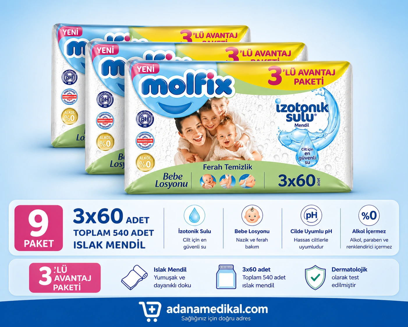 Molfix İzotonik Islak Mendil 3×180 Adet (Toplam 540 Adet), günlük hijyen ihtiyacınızı karşılamak için geliştirilmiş, cilt dostu ve güvenli bir temizlik ürünüdür. Özellikle hassas ciltler için uygun yapısı sayesinde hem bebeklerde hem yetişkin bakımında rahatlıkla kullanılabilir.