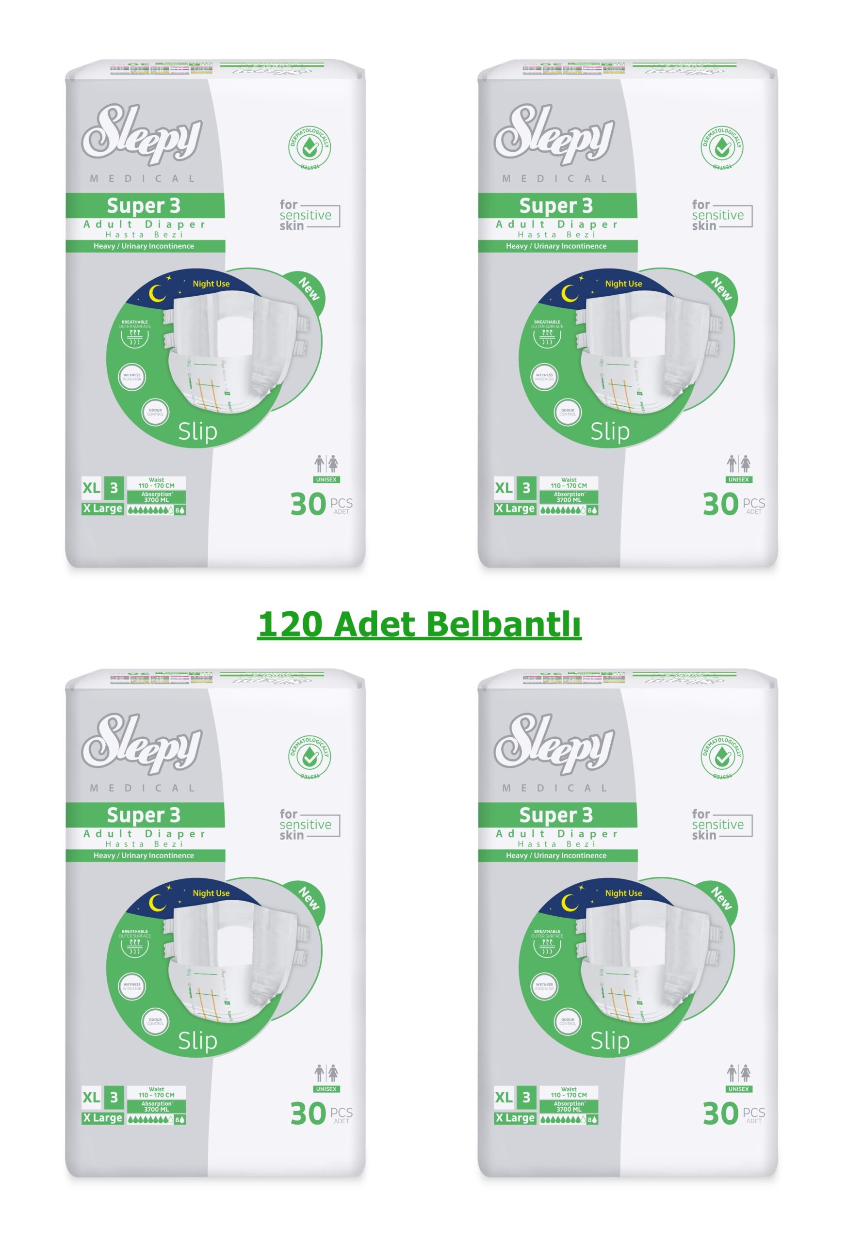 Sleepy Medical Süper 3 Belbantlı XL 120 Adet hasta bezi, çok yüksek emiş gücü gerektiren durumlar için geliştirilmiş güvenilir ve konforlu bir yetişkin bakım ürünüdür. 3700 ML emiş kapasitesi sayesinde sıvıyı hızla emmeye yardımcı olur ve uzun süre kuru kalma hissini destekler.